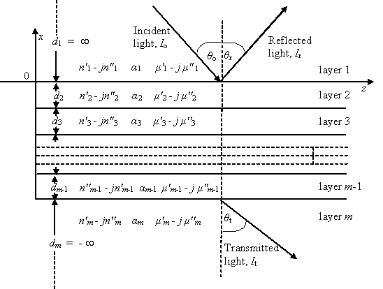 i.e. a thin multilayer of m layers, where m includes the two outer semi-infinte layers (layer 1 and layer m), each layer characterised by a thickness, di, and a refractive index, which if the layer is absorbing will be complex, ni = n'i - jn''i [j is used, in this document, to represent the square root of minus one and asterisk superscript * is used to indicate a complex conjugate] and a relative magnetic permeability, μi = μ'i - jμ''i [default values set to unity]. If the layer is absorbing the absorption term may be entered as the imaginary part of the complex refractive index, i.e. as n''i, or as the absorption coefficient, αi, where n''i = αi/(4πλ) and λ is the wavelength of the incident wave. The refractive indices of some common glasses, air, water and aqueous solutions of sodium chloride, sucrose and polyvinyl alcohol and of the metals gold and silver [allowing this Reflectivity class to be used in surface plasmon resonance simulations], may be obtained using methods in the class RefractiveIndex.