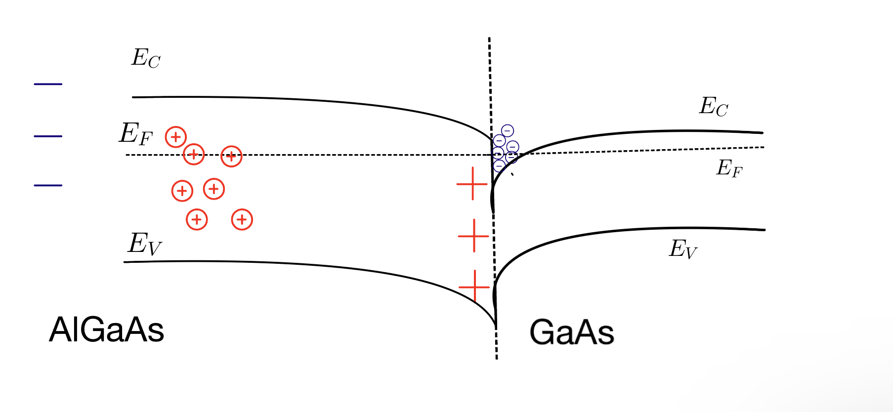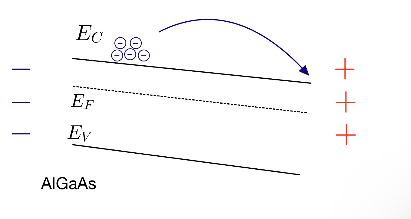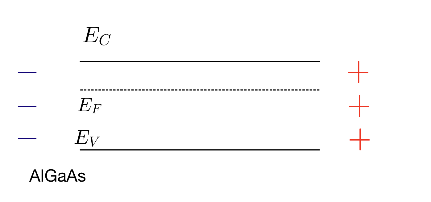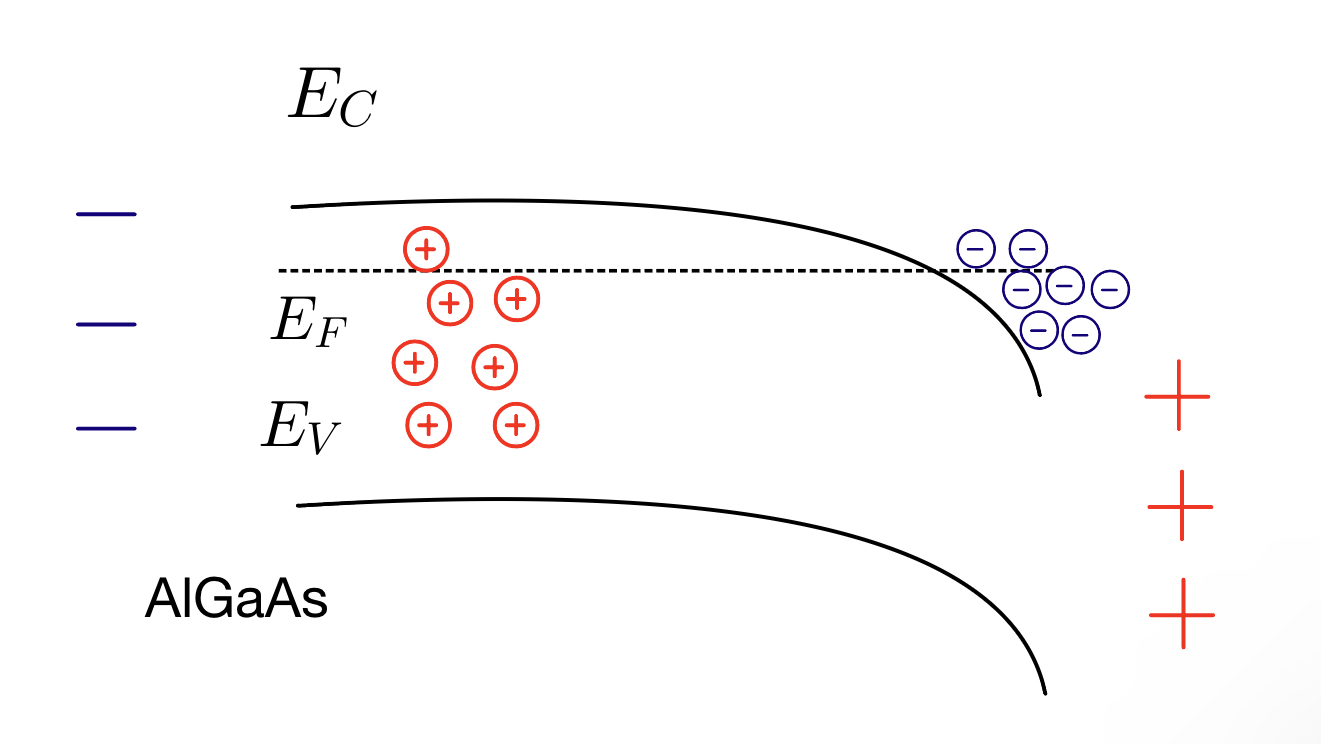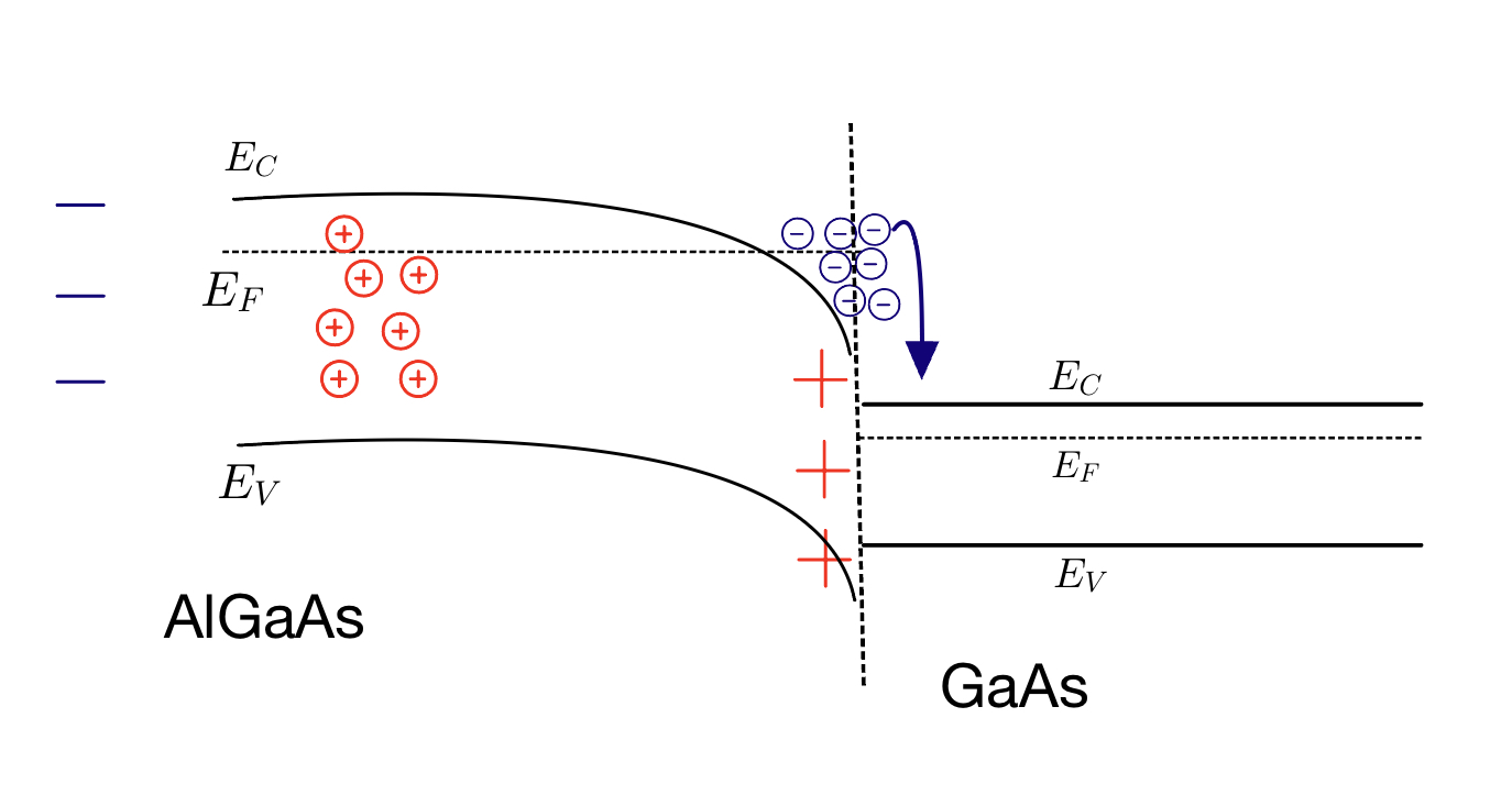 Next, consider that the material is now connected to GaAs, which has a smaller bandgap residing in the range of AlGaAs bandgap. Negative charges at the interface will find it more favourable to fill the lower energy state that is in the GaAs side of the heterostructure interface.Â