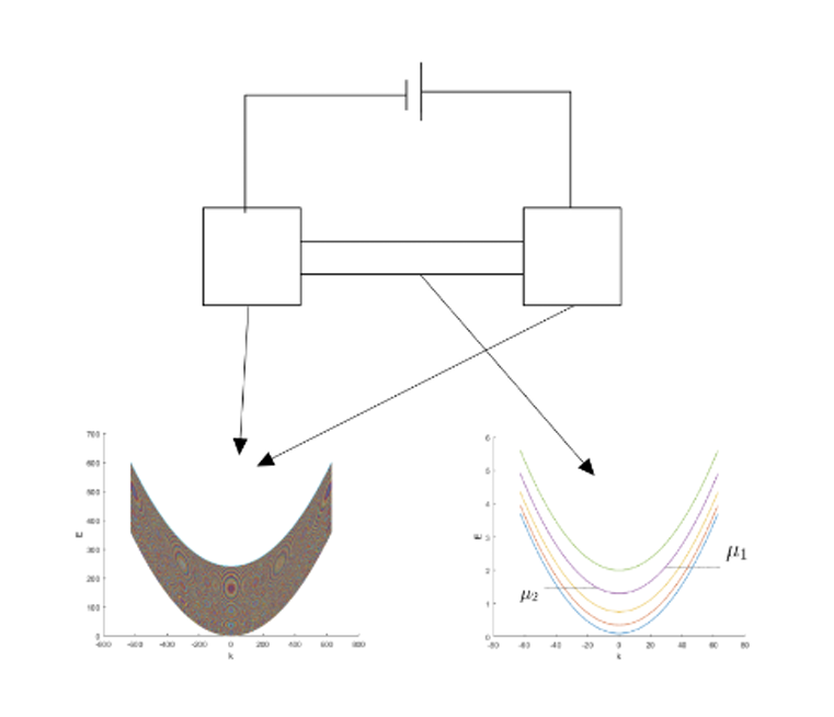 The chemical potential at the source and drain determines the number of subbands that are contributing to conductance where each of the subbands has a minimum energy above which the subband contributes. For a given energy, the number of transverse modes (or subbands contributing to the conductance) can be calculated as a function of excitation energy, E [1].Â
