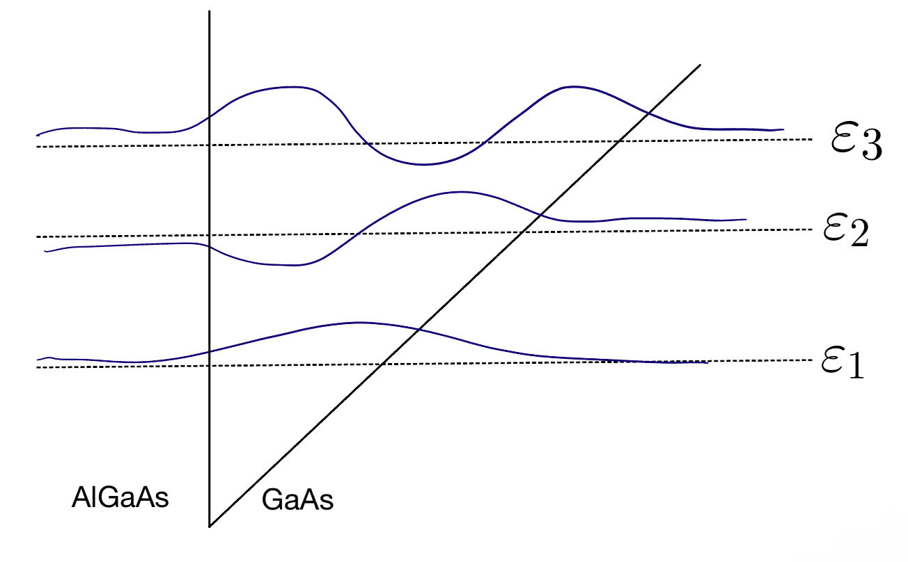 This length in the z-direction is so narrow that a significant level of quantisation is achieved, where different eigenvalues represent different subbands which would correspond to different density of states in the 2DEG. The subbands formed in the triangular quantum well are shown with a hand sketch. In our research, we are usually interested in accessing the lowest 2D subband during our experiments.Â