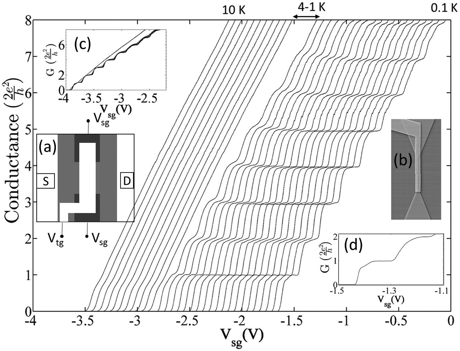 Cooldown characteristic and device layout of a typical one-dimensional (1D) quantum wire. (a) A schematic of the device consisting of a pair of split gates (in black), and over it, a cross-linked polymethyl methacrylate (PMMA) in grey acts as a dielectric for the top gate in white. S and D form the source and drain for the two terminal conductance measurements. (b) A magnified scanning electron micrograph of a top-gated, split gate device. The top gate spans an area of 1 μm, and the split gate is 400 nm long and 700 nm wide. (c) A conductance plot of a 1D device as the sample was cooling down in a dilution refrigerator. The starting temperature was 10 K and continuous split gate voltage sweeps were performed until the base temperature was 100 mK. The main plot shows the data in (c) replotted by setting a horizontal offset between the consecutive traces. On the top, a temperature range is indicated which is not true to scale. (d) A well-defined 0.7 conductance anomaly is observed at 100 mK in a different cooldown [9]. Figure taken from Ref[9].