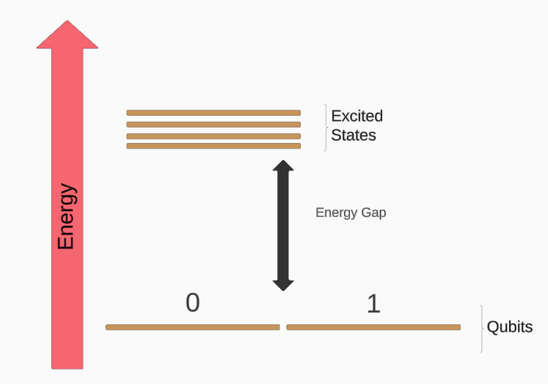 Decoherence arises if the qubits that we want for the computation couples with the excited states during some process. In topological states, one now considers gapped phases with a hidden or protected degenerate ground state in which qubits could be realised. Figure adapted from Ref[6].