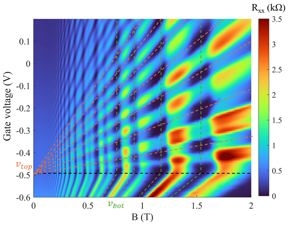 Figure 3: The longitudinal magnetoresistance as a function of magnetic field and top gate voltage measured in our lab.Â