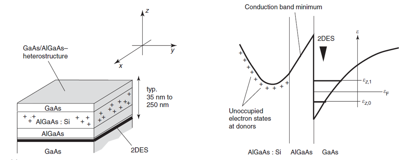 Figure 1: (a) GaAs/AlGaAs heterostructures with a 2DEG at the heterojunction in GaAs. (b) Sketch of the respective profile of the conduction band edge in the z-direction.